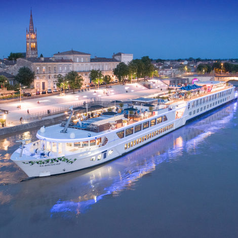 The S.S. Bon Voyage was a ship previously owned by another line that was completely transformed by Uniworld and launched in its new form in 2019 to sail in Bordeaux, France. This intimate "Super Ship" carries just 124 guests in 61 staterooms and suites, offering an exclusive and personalized journey through France’s world-renowned wine regions. The ship’s design is inspired by the elegance of French fashion and has multiple dining venues, including a al fresco dining option on the top deck. It features an infinity-style pool, a spa, and a fitness center.